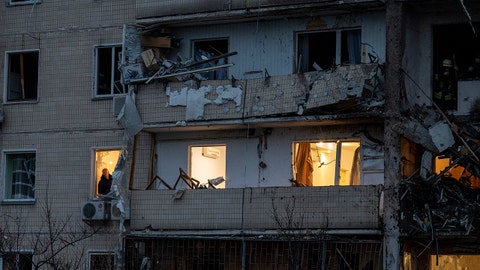 with title “A man inspects the damage at a building following a rocket attack on the city of Kyiv, Ukraine, Friday, Feb. 25, 2022. (AP Photo/Emilio Morenatti)”
