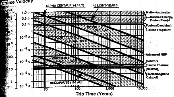 * from Frisbee’s Evaluation of Propulsion Options for Interstellar Missions. A couple of other primers on interstellar propulsion options are Forward’s Ad Astra, and the initial report from the USAF’s Project Outgrowth. They might make good primers for anyone interested in this topic or these series of posts. Note: They do NOT include the Mach Thruster mentioned above that may actually be the best candidate for eventual interstellar drives because progress on it has been very recent.