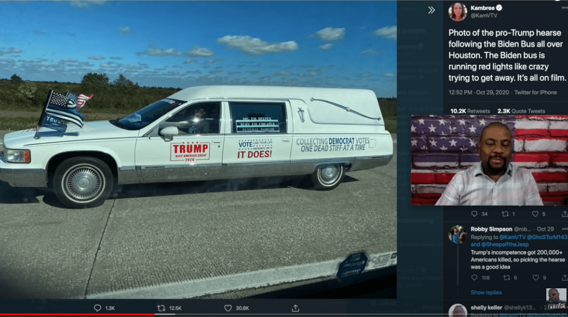 I don’t know if the hearse was involved,but there was just a report that a Trump Train surrounded a Biden Bus in Texas and the bus has to pull over, leading to two canceled Biden events.