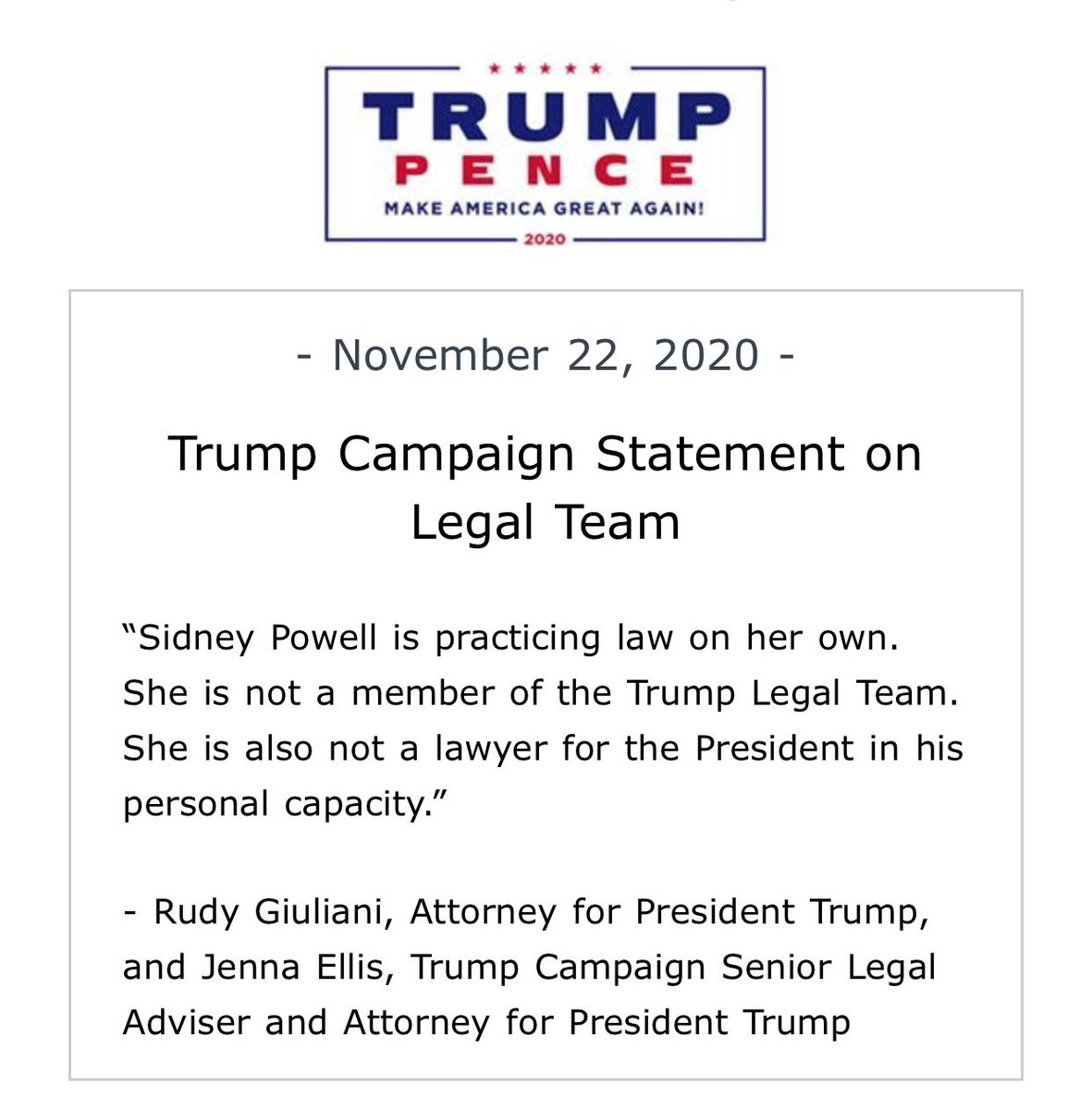 “Sidney Powell is practicing law on her own. She is not a member of the Trump Legal Team. She is also not a lawyer for the President in his personal capacity.”