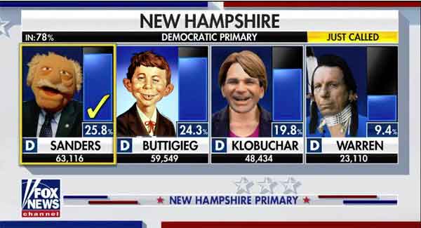 The big news coming out of the NH primaries this week was that Comrade Bernie narrowly won with Socialist supporter Butt-Plug hot on his tail (where else?) while Gaff-o-matic Joe and Faux-cahontas appear to be in a race to the bottom to see who drops out first. On the GOP side, the TrumpMonster got more votes in a purely symbolic contest than the last 2 incumbent DemocRAT Presidents COMBINED! So much for an enthusiasm gap.